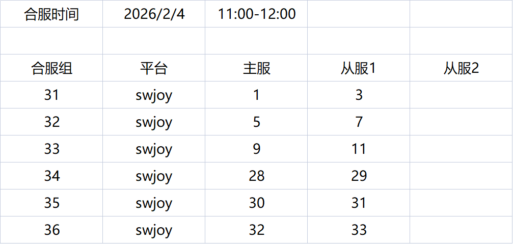 合服基本也是需要匹配上,举例如下,后续合服时也会给予推荐进程,平台可直接采用